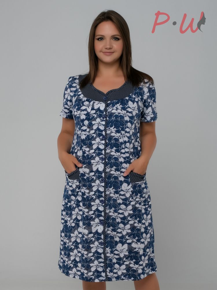 Описание: Прямой халат с коротким рукавом и округлым вырезом горловины, переходящим в планку на пуговицах. По переду халата выполнены рельефы, переходящие в карманы. Расположение рисунка может меняться.
