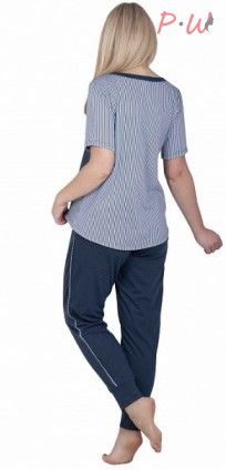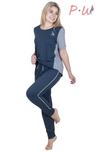 Описание: Пижама из мягкого хлопка, состоит из футболки и брюк на удобной резинке с декоративным атласным бантом. Спущенные рукава пижамы и округлый вырез горловины делают эту модель необычайно комфортной и визуально подчеркнет Ваши лицо и плечи. Спокойный тона ткани и небольшой принт в виде кошки с клубком ниток делает образ более спокойным и домашним.