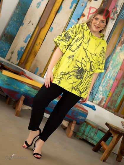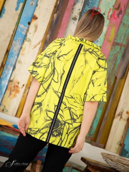 Описание: Свободная блуза Т-образного силуэта выполнена из смесовой ткани с большим содержанием натурального волокна. Модель с просторным рукавом длиной 3/4, нижняя часть рукава оформлена таким образом, что рукав можно носить на отворот. Линия горловины округлой формы, слегка расширена к плечам и оформлена мягким воротником-хомутиком. Вдоль среднего шва спинки настрочена декоративная тесьма контрастного цвета. Изделие выглядит очень эффектно, за счет оригинального рисунка ткани. Модель с разноуровневым низом: спинка длиннее полочки. Такой крой позволяет зрительно удлинить ноги и сделать фигуру стройнее. В боковых швах обработаны разрезы.