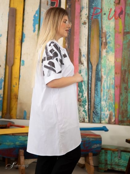 Описание: Удлиненная блуза-туника свободного силуэта выполнена из тканей-компаньонов с высоким содержанием хлопка. Особого внимания заслуживает качество материала: ткань шелковистая, приятная на ощупь, с благородным блеском. Модель с рукавом длиной за локоть, покроя кимоно, с отворотом по низу. На полочке и спинке расположены подкройные кокетки, переходящие на рукав. В линию кокетки спинки втачен декоративный хлястик. Воротник рубашечный на стойке, застежка-поло на купные пуговицы. На полочке обработаны крупные накладные карманы. Вход в карман располагается со стороны боковых швов. Модель отлично маскирует проблемные зоны и стройнит фигуру.