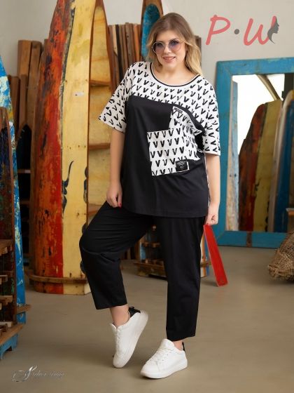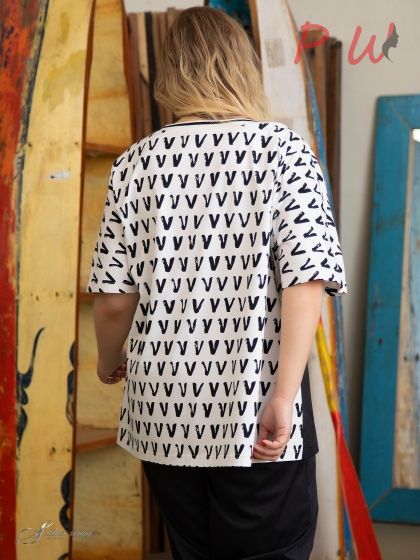 Описание: Оригинальный трикотажный блузон Т-образного силуэта выполнен на основе комбинации разнофактурных материалов с высоким содержанием хлопка. Горловина округлой формы, немного расширена к плечам. Рукав цельнокроеный, длиной до локтя. На полочке обработана подрезная кокетка. Дополняют образ пара крупных карманов, хаотично настроченных один поверх другого, и ненавязчивый декор. В модели чувствуются задор и непринуждённость.