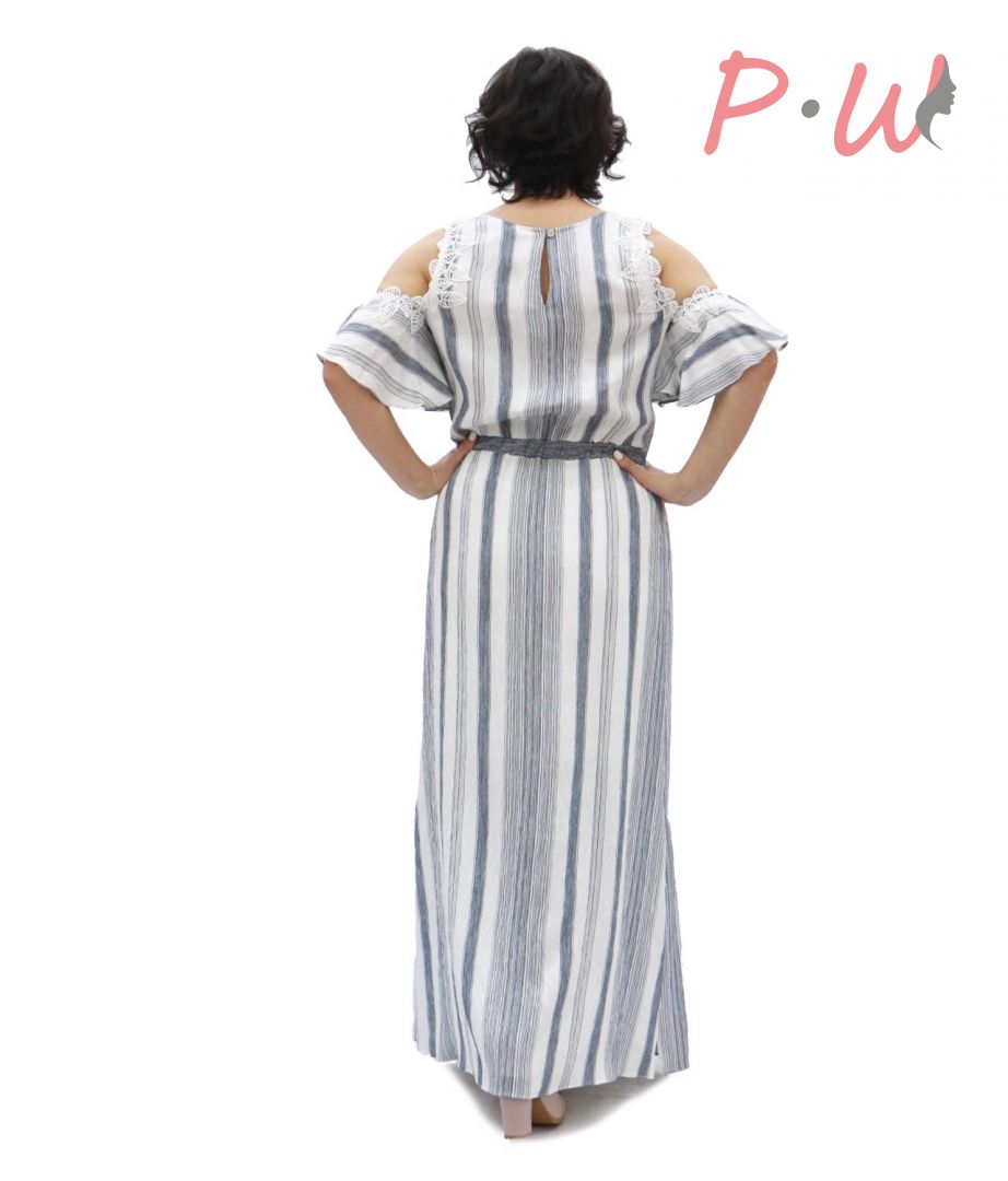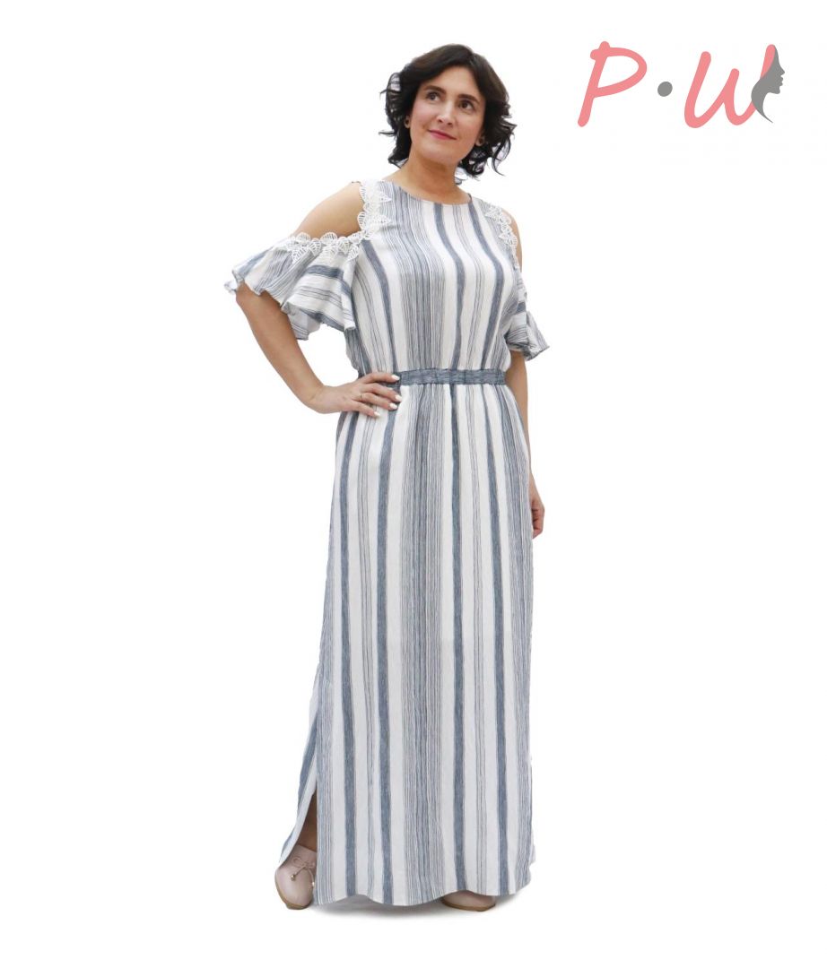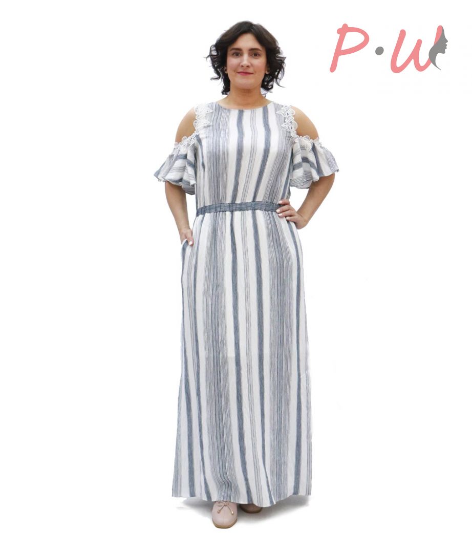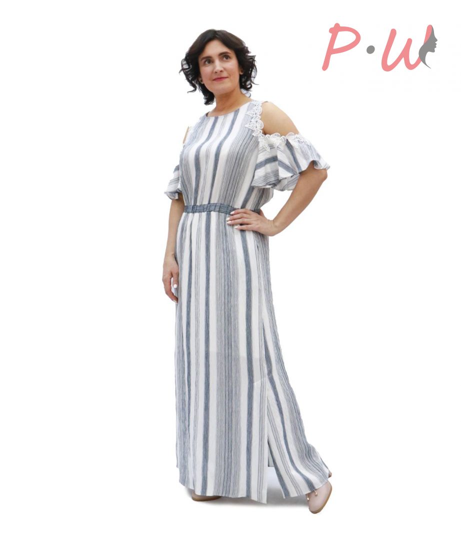 Описание: Платье длинное, прямого сиуэта, с открытыми плечами. По талии собрано на резинку. По бокам карманы, шлицы. Вырез круглый. Рукав -воланом, украшенным по линии плеча шитьем. Застежка на спинке в виде «капельки» с пуговицей.