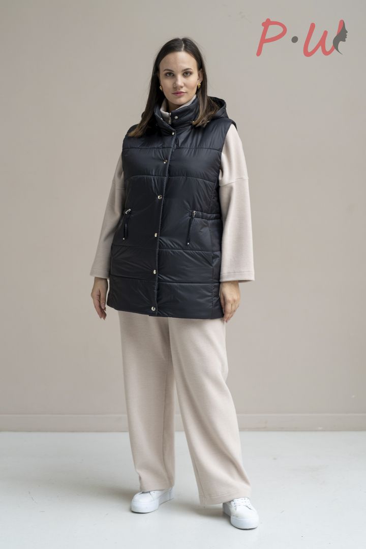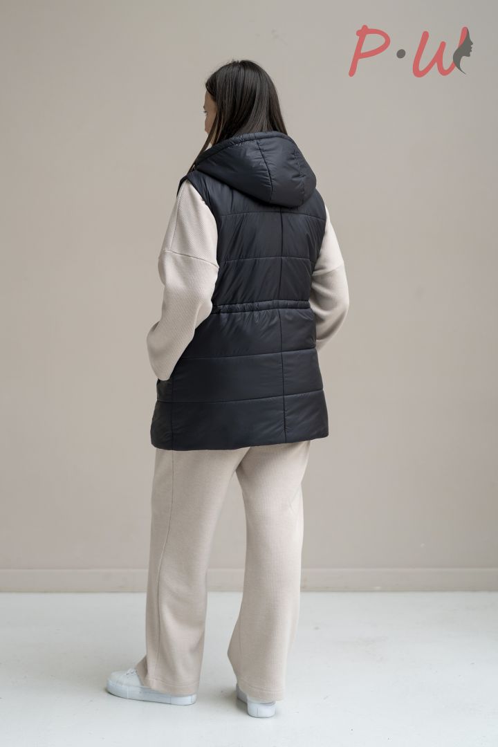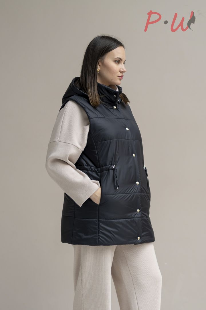 Описание: Легкий жилет прямого силуэта с углубленной проймой. Воротник – стойка. Капюшон съемный с регулируемой резинкой в кулиске. Боковые карманы в рельефном шве. На талии выполнена кулиска. Жилет застегивается на кнопки.