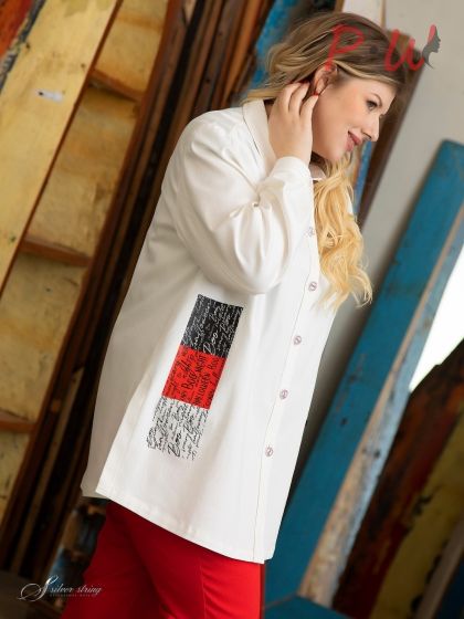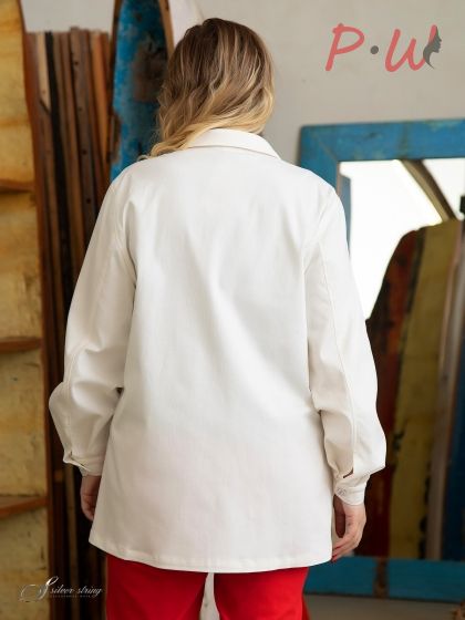 Описание: : Стильный удлиненный жакет, стилизованный под «джинсовую рубашку», изготовлен из смесовой ткани с эластаном. Модель прямого силуэта, с рубашечным воротником и длинным втачным рукавом. По низу рукава притачена манжета, обхват которой можно регулировать за счет парных пуговиц. По борту обработана застежка на контрастные пуговицы-болты. На левой стороне полочки расположен прорезной карман с молнией. Правая сторона задекорирована оригинальным притом. Аналогичный принт размещен на левом рукаве. В боковых швах обработаны разрезы. Удобный крой, эффектный дизайн - все это отвечает современным модным тенденциям и делает модель неповторимой.
