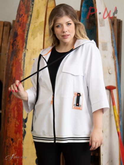 Описание Молодежный жакет-бомбер прямого силуэта, с капюшоном и втачным рукавом, длиной 3/4. Модель изготовлена из трикотажного полотна «футер». Футер это один из самых комфортных для тела материалов. Лицевая сторона трикотажа выглядит, как кулирная гладь. С изнаночной стороны с помощью петельных протяжек нити прикрепляются к основе полотна, образуя своеобразную фактурность. Благодаря введению полиэстера и эластана, футер становится более устойчивым к деформациям, прочным и долговечным. В качестве отделочного материала используется однотонная смесовая ткань с большим содержанием натурального волокна. Из отделочной ткани выполнены нагрудные карманы и клапана, расположенные на полочке, а так же планка лицевого выреза капюшона, сквозь которую продернут шнур-затяжка. Застежка на молнию контрастного цвета. Бегунок на застежке декорирован яркой подвеской. Цвет подвески перекликается с цветом нашивки на кармане. Низ изделия обработан трикотажным подвязом с полосой. Удобный крой, эффектный дизайн - все это отвечает современным модным тенденциям и делает модель неповторимой.: